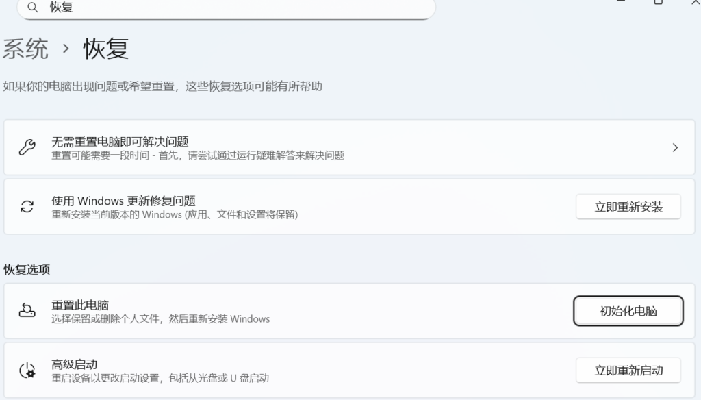 在电脑上打开设置,搜索恢复,点击重置此电脑就行。